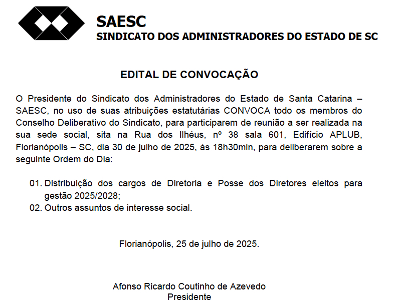 Edital de Convocação do Conselho Deliberativo do SAESC – Dia 30/07/2025 , as 18:30h, em segunda chamada